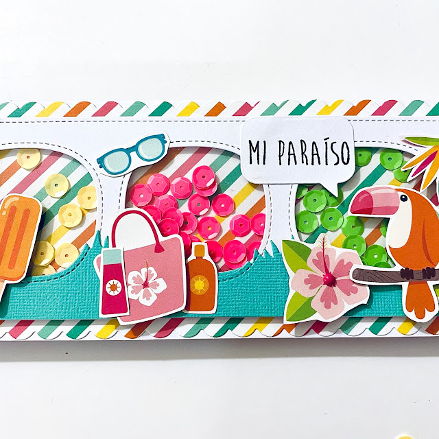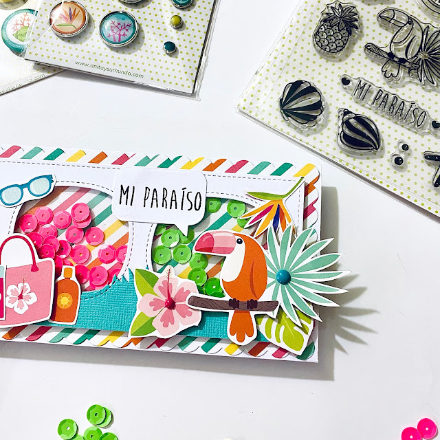 Para crear la tarjeta he usado los papeles, recortables y lentejuelas de Mi Paraíso de Anita y su mundo, con mi adorado Tucán.